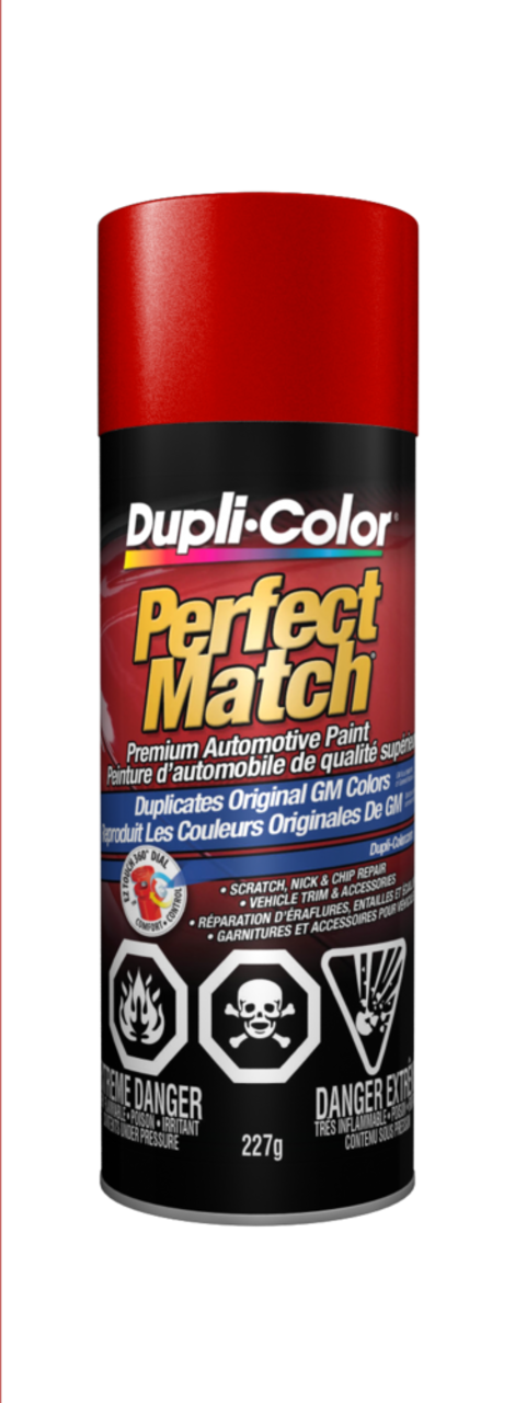 Find your match with Dupli-Color® Perfect Match® Premium Automotive Paint, Red Metallic. This easy-to-use, high-quality, fast-drying, acrylic lacquer aerosol paint is specially formulated to match the exact colour of your vehicle’s original factory-applied coating. Ideal for use on all OEM paint surfaces, Perfect Match is available in a complete line of exact-match colours for current and late model import and domestic vehicles. This Dupli-Color® paint is handy for small-scale vehicle touch-ups and for painting vehicle accessories.Features Premium automotive paintFeatures an EZ Touch 360° nozzleIdeal for large touch up jobsDry to touch in 30 minutesAvailable in OEM exact-match colorsColour: Red Metallic (75WA8919)Size: 227 gSpecifications Part Number CBGM05377 Advanced Features Vendor Make Colour Match Application Method Aerosol Base Type Not Applicable Colour Red Compatible Surfaces Metal, Fiberglass, Aluminum, Plastic Dry Time To Recoat 10 h Dry Time To Touch 30 min Manufacturer Part Number CBGM05377 Maximum Temperature (°C) 35 °CView more specifications Resources Our return policy View full return policy Return Policy WarrantyThis product carries a 1 year exchange warranty redeemable at any Battery World Store. User Manual View user manuals and additional product information Download