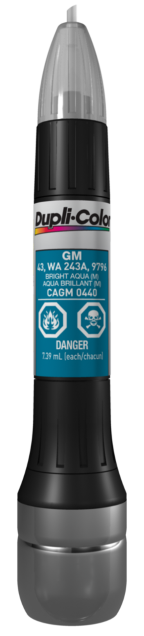 The Dupli-Color Scratch Fix All-in-1 Touch Up Paint in Bright Aqua Metallic offers a simple yet effective solution for fixing minor scratches and chips on your vehicle. This convenient touch-up tool features a 3-in-1 design, combining an abrasive prep tip, factory-matched paint, and a clear coat in a single package. Colours are tested and approved by vehicle manufacturers for a perfect match to the original factory finish so you can confidently restore your vehicle’s appearance right from your own garage.Features Unique one-coat prime and paint formulaAbrasive tip removes loose paint and rust prior to paint applicationPen tip for fine scratchesBrush end for larger chipsClear coat to seal, protect and ensure a perfect factory matched finishSize: 7.39 mL (0.2 oz)Colour: Bright Aqua Metallic (43 WA9796,43 WA243A)For use with GM vehiclesSpecifications Part Number CAGM0440 Advanced Features No Advanced Features Application Method Applicator Pen Base Type Not Applicable Colour Blue Compatible Surfaces Metal, Aluminum, Fiberglass, Plastic, Other, Vinyl, Wood, Stainless Steel Dry Time To Recoat 30 h Dry Time To Touch 30 min Manufacturer Part Number CAGM0440 Maximum Temperature (°C) 35 °CView more specifications Resources Our return policy View full return policy Return Policy WarrantyThis product carries a 1 year exchange warranty redeemable at any Battery World Store.