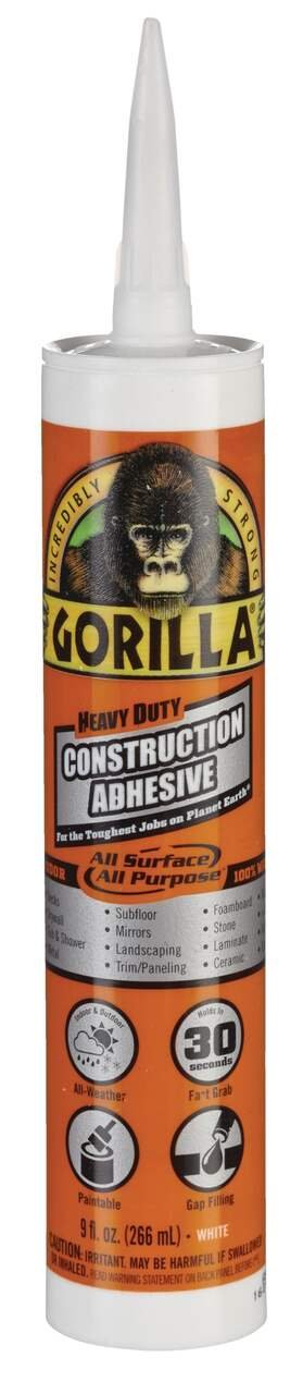 Product DetailsThe Gorilla All-Weather Indoor/Outdoor Heavy-Duty Construction Adhesive Glue, White, 9-oz, is a tough construction adhesive that can bond just about anything, rain or shine. Whether you’re attaching outdoor furniture, repairing a leaky window frame, or sticking down tiles, this adhesive has the strength for the job. It dries quickly to create a water-resistant, virtually invisible seal that ensures your projects last.Features All Weather – Indoor and Outdoor UseFast Grab – Holds in 30 secondsPaintableGap FillingVOC CompliantLow OdorNon-foaming formulaSize: 266 mL (9 fl oz)Specifications Part Number 8110003 Accessories List No Accessories Included Advanced Features Paintable, Low VOC, Low-Odour Application Method Caulk Gun Certifications No Certifications Consumer Pack Size 1 Dry Colour White Finish None Full Cure Time (minute) 1 min Glue/Paste/Patching Compound Type Construction AdhesivesView more specifications Resources Our return policy View full return policy Return Policy WarrantyThis product carries a 1 year exchange warranty redeemable at any Battery World Store.