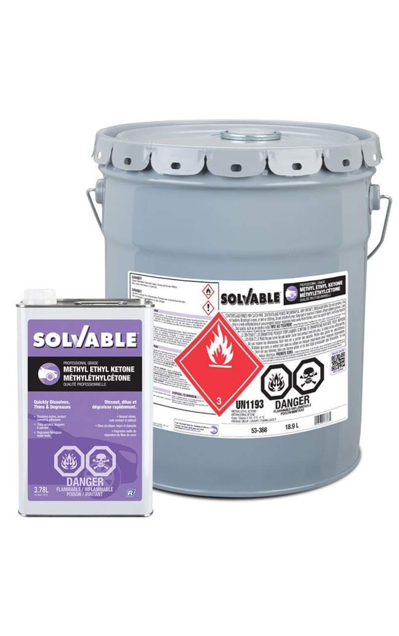 Product DetailsEssential for automotive and fiberglass repairs, Solvable Methyl Ethyl Ketone (MEK) is an effective solvent used to dissolve resin, contact cements and adhesives. This 18.9 litre jug of MEK is perfect for degreasing tools with its ability to strip coatings and cut through oil. Use this MEK mixture to tackle tough degreasing jobs efficiently and effectively. 1 year exchange warranty included.Features Solvable Methyl Ethyl Ketone (MEK) dissolves resins, contact cement and adhesivesThins acrylics, lacquers and epoxiesDegreases fibreglass repair toolsSize: 18.9 L (5 US gal)Specifications Part Number 53-368H24 Flammable Yes Non-toxic When Used as Intended Yes Advanced Features No Advanced Features Product Height (in) 13.39 in Product Weight (lb) 39.90 lb Chemical Form Liquid Flash Point (°C) -6.10 °C Painting Chemical Type Methyl Ethyl Ketone Product Volume (L) 18.90 lView more specifications Resources Our return policy View full return policy Return Policy WarrantyThis product carries a 1 year exchange warranty redeemable at any Battery World Store.